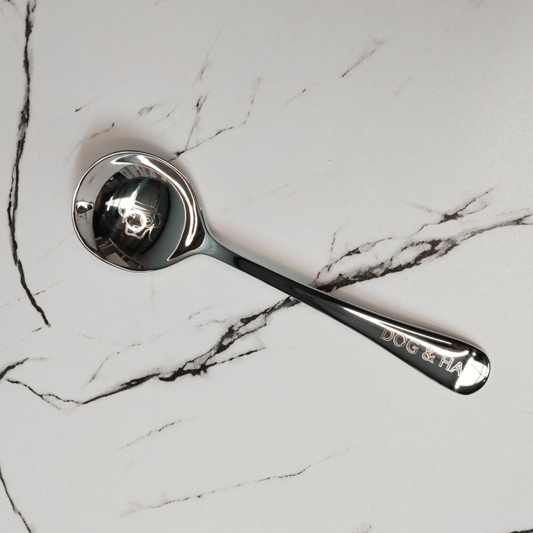 18/10 stainless steel cupping spoon engraved with Dog & Hat logo in the bowl and 'Dog & Hat' on the handle.