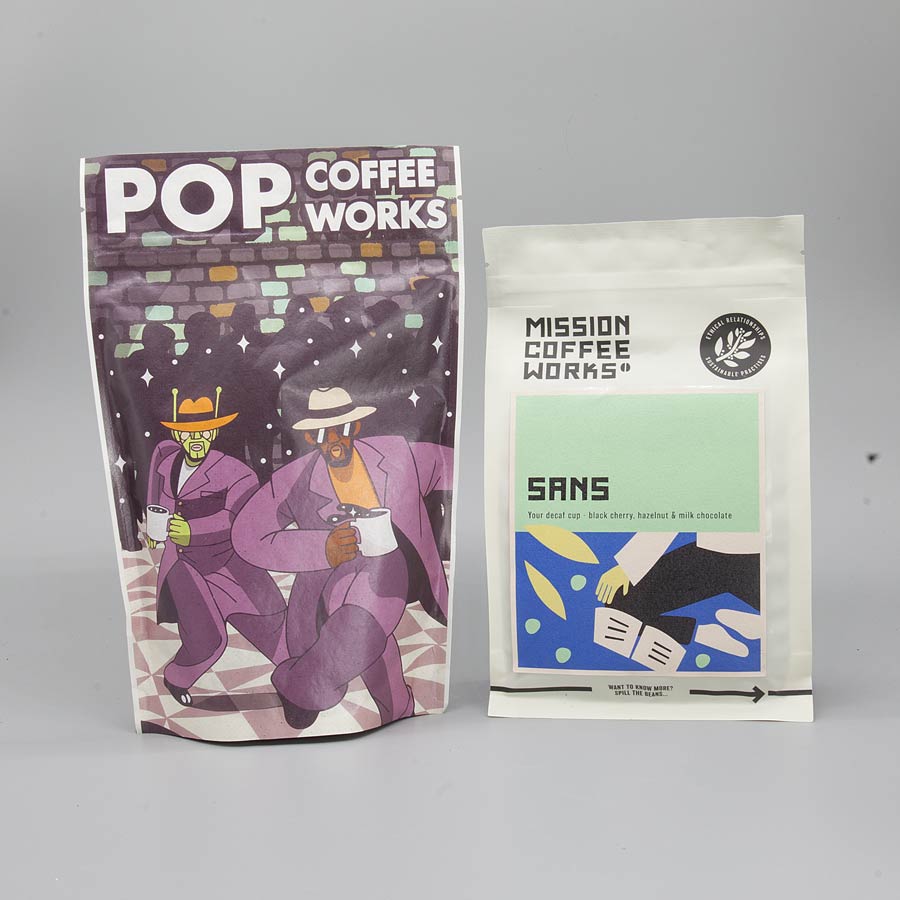 - 2 x 250g* bags of freshly roasted coffee suitable for espresso, one which is caffeinated and one decaffeinated.